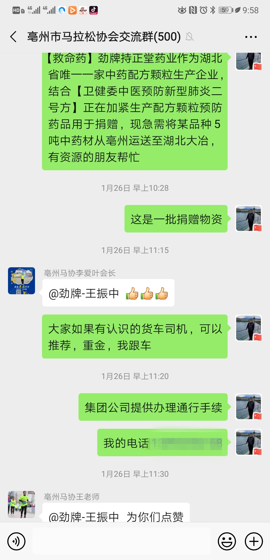 我還聽說,為了這次藥材采購,勁牌人非常拼!在找車、找司機上協調了很多資源。勁牌公司常務副總裁王楠波親自協調安徽阜陽、亳州的經銷商和營銷人員,協助尋找物流資源。安徽亳州保健酒經銷商趙總、白酒經銷商南總,阜陽總經銷商蔣總、市場營銷經理丁雷、王振中行動迅速,建立了專門的微信群,發動親朋好友和員工,尋找合適的車輛和司機。大家翻遍了朋友圈內貨運行業從業朋友的信息,電話打了一個又一個,各種微信交流群里分享找車信息。