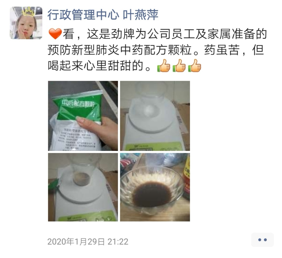 收到這份關(guān)愛(ài)多人,除了對(duì)公司滿懷的感恩,還有對(duì)背后生產(chǎn)者的傾情致敬。正如今日的頭條所說(shuō),正是我們這些一線生產(chǎn)者的日夜兼程,才有這一份份滿含愛(ài)心的中藥配方顆粒,被運(yùn)送到所需要的四面八方,小小的一盒到底凝結(jié)了多少人的心血,我們每個(gè)勁牌人應(yīng)該深深銘記。